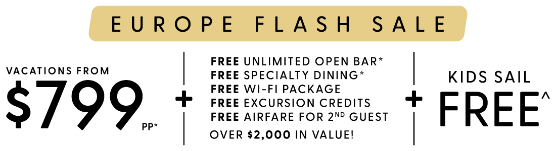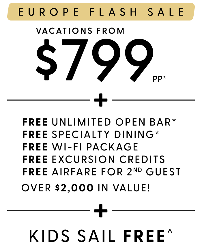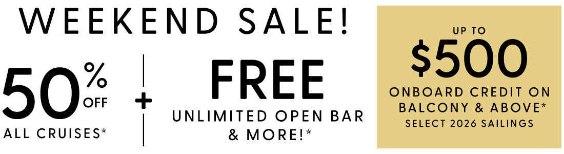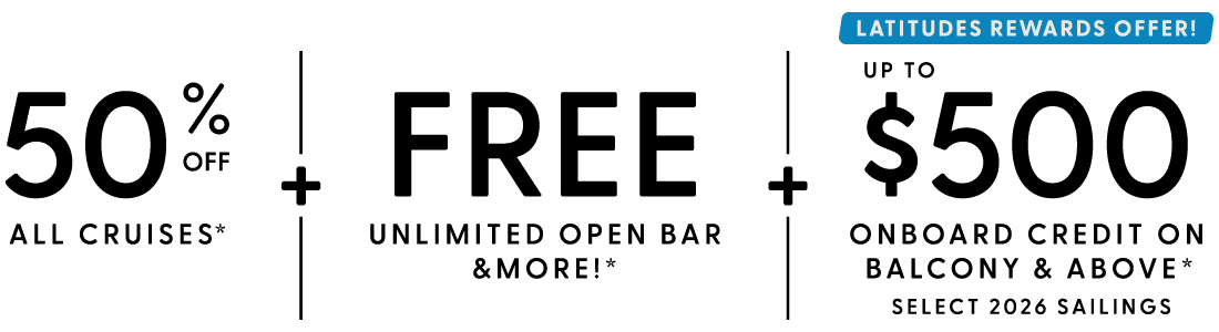 • Additional cost added to booking for optional package selections Unlimited Open Bar and Specialty Dining. Free 3rd & 4th Guests on select cruises. Restrictions apply.