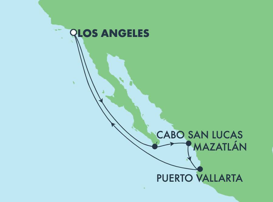 Enjoy an unforgettable 7-day round-trip from Los Angeles. Journey to the jewel of the Baja Peninsula, Cabo San Lucas, famous for its world-class sportfishing, as well as its high-end resorts. Sip Margaritas, enjoy authentic Mexican cuisine and take a drive along the foothills of the Sierra Madre Mountains in Mazatlán. Then immerse yourself in the small village charm of Puerto Vallarta, with its 26 miles of spectacular beaches along the Banderas Bay.