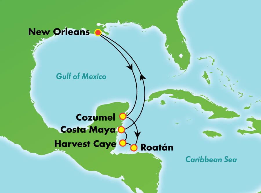 Leave the Big Easy behind for this weeklong cruise in the Caribbean. Your first stop is Cozumel on the coast of Mexico’s beautiful Yucatán Peninsula. The day is yours to snorkel, dive fabulous reefs, explore the jungle in an ATV, relax poolside at a beach club, or visit an ancient Mayan temple. Experience sun, fun and sand in Harvest Caye, the premier resort-style destination in Belize — cool off with a drink at the swim-up bar. And while in Costa Maya, ponder the lives of the ancient Mayans as you explore fascinating ruins, or opt instead to snorkel the second-largest barrier reef in the world.