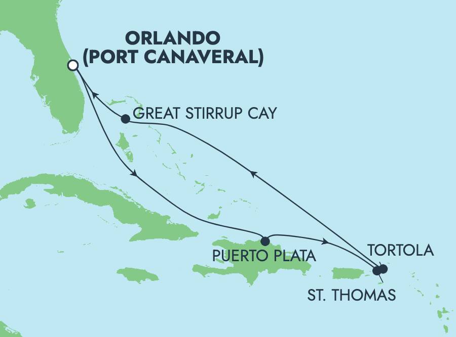 Your tropical paradise is on the horizon aboard this round-trip cruise from Port Canaveral. Fly high above the jungle floor on an exhilarating zipline then enjoy a refreshing dip in the pools below the breathtaking Damajagua waterfalls in Puerto Plata. In St Thomas, greet the green sea turtles and colorful fish as you snorkel the turquoise waters of Turtle Cove. Jump in a Jeep and head off-road to one of Tortola’s most secluded beaches, Smuggler’s Cove. Then sit back and relax in your private beachfront cabana in Great Stirrup Cay, our private island paradise that’s just for you.