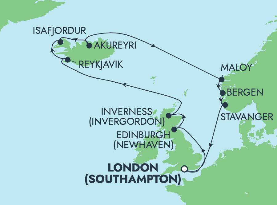 Begin and end your long-awaited vacation in the storied harbor of Southampton. As you depart from this iconic port, you’ll embark on a voyage that leads you to the far corners of Northern Europe and the Mediterranean, where each destination offers its own unique charm and allure. In Newhaven, immerse yourself in the historic enchantment of Edinburgh with visits to majestic castles and leisurely strolls along the Royal Mile. Journey north to Reykjavik, where you can unwind in the geothermal embrace of the Blue Lagoon or embark on a thrilling Golden Circle tour, exploring geysers, waterfalls, and volcanic craters. In Bergen, wander through the UNESCO-listed Bryggen Wharf, with its vibrant wooden houses, or ascend Mount Floien in a funicular for breathtaking views of the fjords.