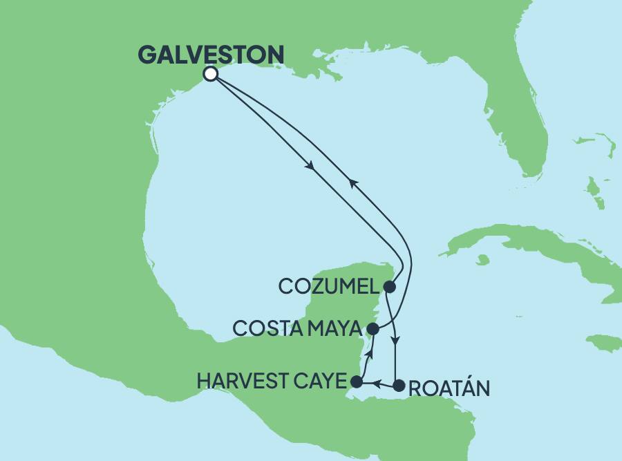 Set sail from Galveston, where Texas charm meets the call of the open sea. In Cozumel, discover vibrant reefs and uncover ancient Mayan ruins — stones that whisper tales under a warm sun. Next, arrive at Roatán Island, where dense jungles and crystal-clear waters offer the best of land and sea. Dive into colorful coral gardens or soar above on a canopy tour through the heart of the island. Finally, head to Harvest Caye, NCL's private Belizean paradise, with its sparkling lagoon, treetop ziplines and beach cabanas perfect for a relaxing day at the beach. Each destination reveals a new wonder, crafting memories that linger like the warmth of the Caribbean as you return to Galveston.