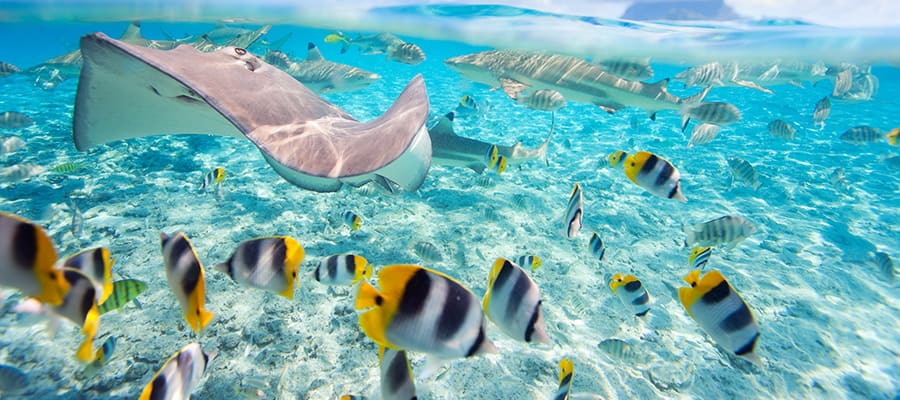 Crystal clear blue waters make swimming and snorkeling exceptional here. Polynesian waters are home to over 800 species of fish. 20 dolphin and whales species live here year-round or stay for a few months in these waters.