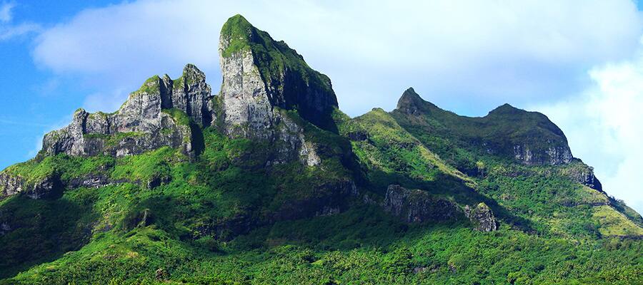 Mount Otemanu is a jagged remnant of an ancient volcano that rises up to a sharp point at 2,385 feet (727 m) from the surface of a turquoise blue lagoon.