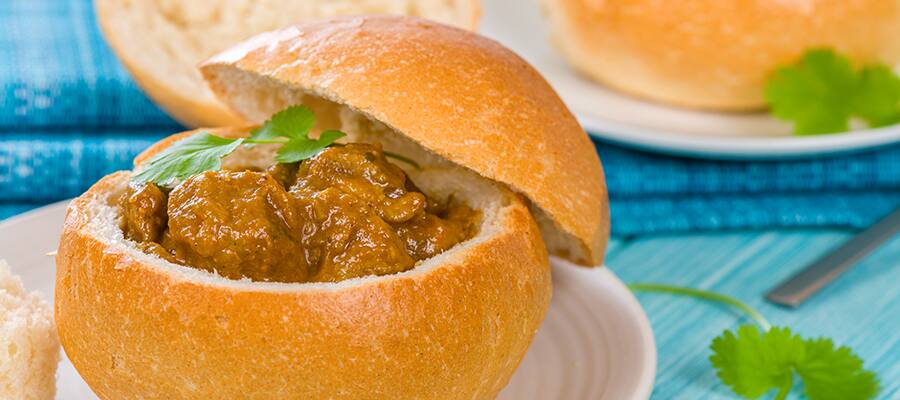 Bunny chow is a very popular Durban street food that has spread in popularity across the country. Despite what the name suggests, no bunnies are listed in the ingredients. Rather, this hearty dish consists of a hollowed out loaf of bread stuffed with spicy curry and chicken, pork or a vegetarian variety.