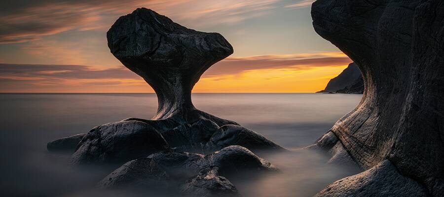 Situated outside Måløy, the famous Kannesteinen Rock is a tall mushroom-shaped rock that sits along the rugged coast and was formed over thousands of years of water erosion. This attraction is a favorite photo op for visitors.