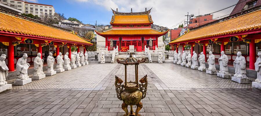 What used to be an old fishing village, Sasebo has been a major naval port since the late 19th century — first with Imperial Japanese Navy and today as a base for the U.S. Navy. Don’t miss a boat tour of the emerald-green 208 Kujuku Islands nearby, a beautiful sight set against the deep-blue waters of the bay. On shore, explore Sasebo’s Zoological and Tropical Botanical Garden, featuring 80 animal and 1,200 plant species, all with spectacular views of the Kujuku Islands. And if you want to go Dutch, head to Huis Ten Bosch, a recreated 17th-century Dutch village complete with colorful tulip fields. For something more authentically Japanese, head to the Yorozu-cho district to visit a market teeming with fresh produce and seafood as well as handmade clothing and pottery.
