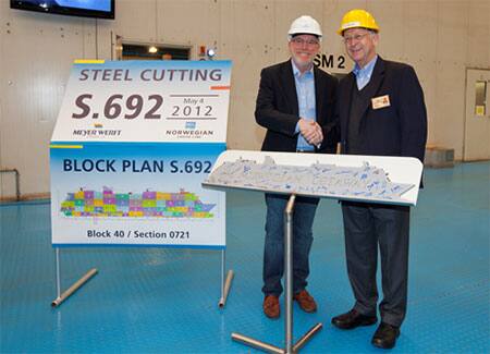 The first piece of steel was cut at MEYER WERFT in Papenburg, Germany on Friday, May 4, for the construction of Norwegian Getaway, the second of two new Freestyle Cruising® ships for Norwegian Cruise Line, set for delivery in spring 2014. Norwegian Cruise Line and MEYER WERFT executives watched as the first plate of steel was cut by a plasma torch in the yard's state of the art facility. This plate will become part of Block 40 that will comprise the new vessel.