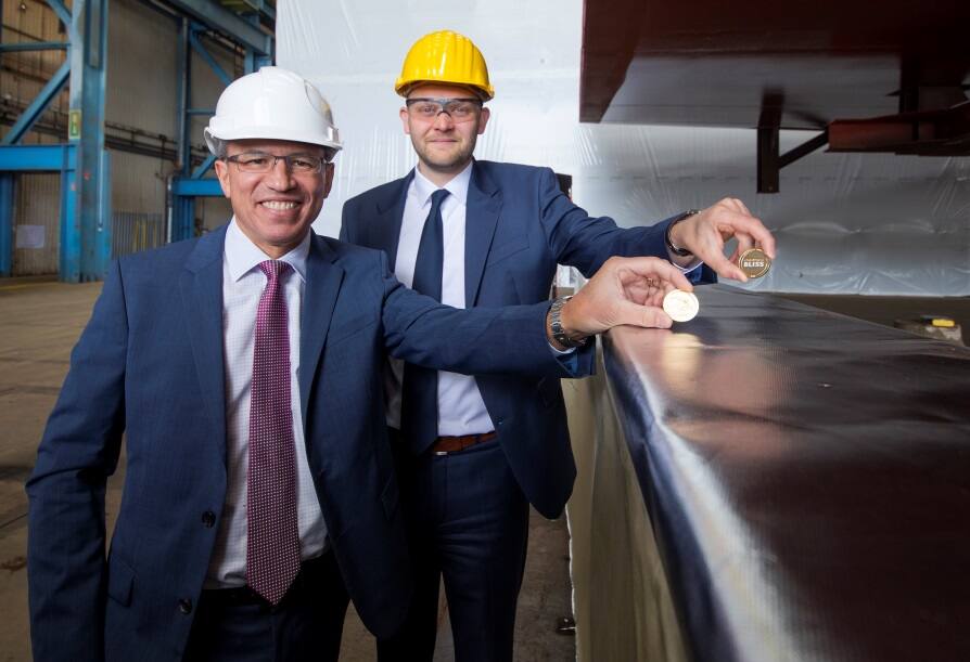 Andy Stuart, Norwegian Cruise Line’s president and chief executive officer, was present in the hall and laid the traditional “lucky coin”, etched with the outline of the ship’s signature hull designed by wildlife artist Wyland, before the block was lowered into place.