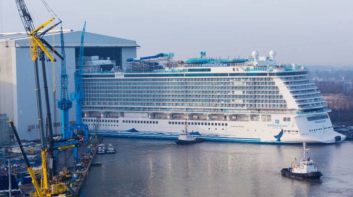 Norwegian Bliss, the third of Norwegian Cruise Line's Breakaway Plus class, emerged from the Meyer Werft building dock in Papenburg, Germany on Saturday, February 17, representing a major milestone in the vessel's construction. The ship will remain in the shipyard port for the final phase of construction, until its conveyance down the River Ems towards the North Sea, scheduled for mid-March. During this time, the first crewmembers will move into their staterooms on board, begin their training, and familiarize themselves with the ship - readying her for the first guests to arrive after delivery in 60 days, on April 19.