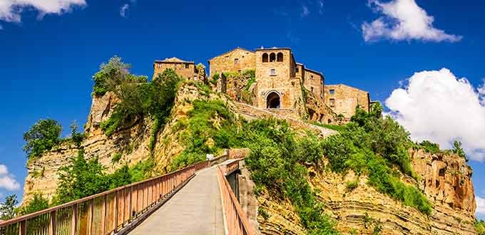 Civita di Bagnoregio perches dramatically atop a steep hill. It was once two separate towns, but the saddle of land that connected Civita to Bagnoregio eroded away, cutting off Civita and making Bagnoregio its only lifeline to the outside world. The only access is by a long footbridge, with supplies transported in by moped.