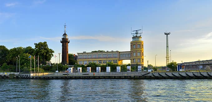 Situated at the entrance of the harbor of Gdansk, the Nowy Port lighthouse combined three distinct functions: that of a coastal lighthouse, a harbor pilots tower, and a time ball station. Like in Greenwich, England, the time ball, which measured 5 feet in diameter and weighed 150 pounds, dropped every day at noon to give a precise time signal to the captains of the ships lying at anchor in the Bay of Gdansk. This allowed them to adjust their chronometers, which in turn allowed them later to establish their ship's position (more precisely the longitude) on the open sea. After your stop here, you will transfer back to the ship.