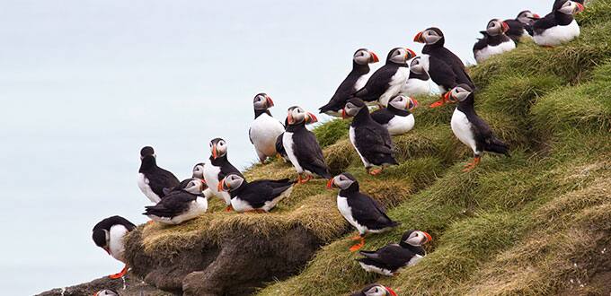 Cruise to rocky Melrakkaey Island to for up-close views of a colony of puffins doing all the things that puffins naturally do. This includes nesting on the steep cliffs, swimming in the sea and perhaps even flying – much faster than you might expect. After a short walk from the pier, you’ll reach and board a small tour boat that is ideal for sightseeing in hard-to-reach places. Craggy little Melrakkaey Island is one of those enviable spots, a protected bird refuge since 1972 where the only crowds ever seen have wings. While you’ll likely spot other seabirds here – like guillemots, shags and kittiwakes – puffins are the star attractions. They’re easy to identify with their bright orange beaks and penguin-like coloring; some people even call them “sea parrots” because of the shape of their beaks. Iceland is the breeding ground for most the world’s Atlantic puffins, and Melrakkaey is one of their favorite spots. You’ll see their nests on the precipitous rocky cliffs and surely spot puffins resting on the water between dives for the tasty small herring they love to eat. Your guide will share fascinating facts about the lifestyle of these charming birds during the excursion.