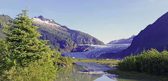 Be among the select few to travel by canoe for an exceptional experience near the face of the majestic Mendenhall Glacier. You’ll paddle across Mendenhall Lake, navigating past icebergs, surrounded by one of the richest samplings of Alaskan wildlife you’ll find anywhere. Birds including arctic terns’ nest in the towering cliffs and eagles, goats, salmon and bears are all common sights. Then, venture within a safe distance of the massive, awe-inspiring face of the living Mendenhall Glacier. Grab a thrill ride by skirting the base of the beautiful and powerful Nugget Falls. Refuel with an Alaskan-style snack. You’ll make your trip in a traditional easy to paddle, 15 - 20 passenger Tlingit-style canoe, an exceptionally stable 28 foot watercraft, with all modern safety gear supplied. Because of the close approach to the glacier face, the U.S. Forest Service tightly controls the number of participants.