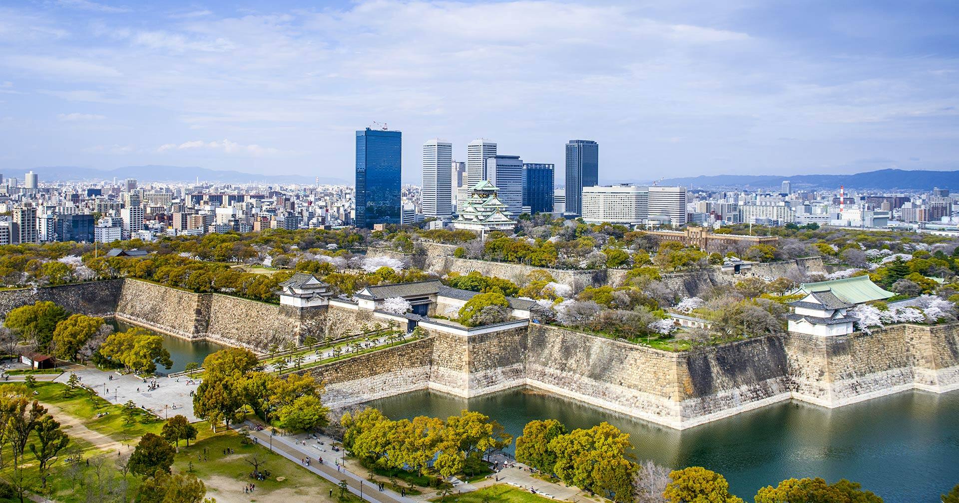 Visit two iconic landmarks in Osaka that represent vastly different time periods: a classic 16th-century castle and a modern high rise made of steel and glass.