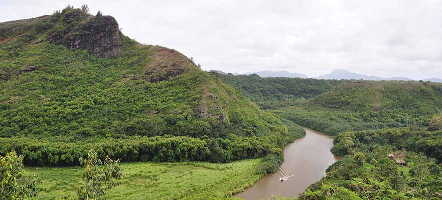 Board a flat-bottom motor launch for your journey up the tranquil Wailua River as it floats past lush jungle landscapes on the way to Fern Grotto. This beautiful lava cavern, dripping with ferns, forms a natural amphitheater with excellent acoustics. At the grotto, keeping with island custom, a chorus will serenade you with the traditional Hawaiian Wedding Song. Travel by moto coach into the valley of the Sleeping Giant, where you'll find Opaekaa Falls, cascading down the hillside into a hidden pool.