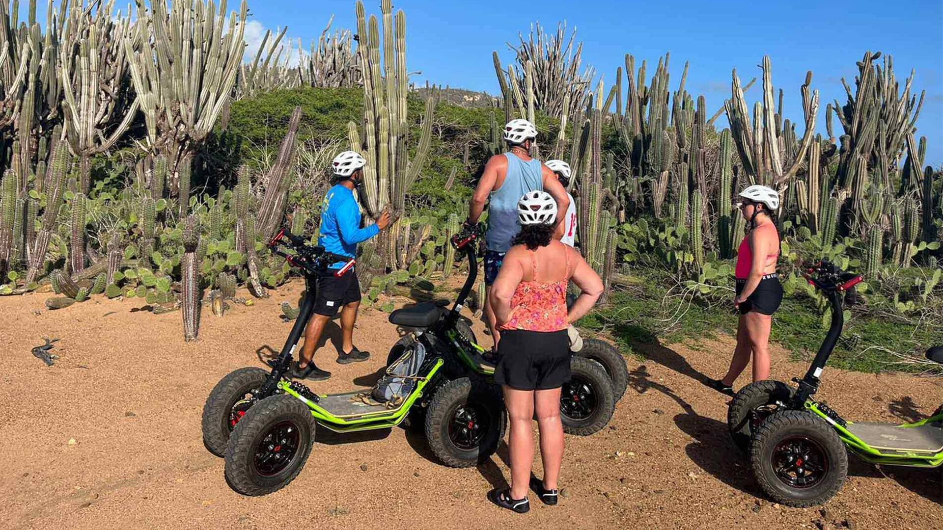 Go off-road through the rugged desert-like landscape along the island’s north coast on an EZ Raider, an electric vehicle that resembles a four-wheel bike. After a briefing and trial run to make sure that you are comfortable on the EZ Raider, you will ride off caravan-style behind the guide. Being emission-free, the vehicles have minimal impact on the island’s delicate ecosystems. You can expect an exhilarating ride, especially once you head off-road and into the sand dunes, where you will find the ruins of the Bushiribana Gold Mill, which opened during Aruba’s gold rush in the mid-19th century. The majority of the attractions will be natural, including a dramatic cave pool along the shore and a limestone bridge that the pounding surf has carved out of the coastal rocks. The guide will elaborate on the sights and their history during stops at the most scenic places.