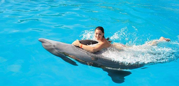 Next, your group of no more than eight participants will head to the Dolphin Lagoon where you’ll wade into the shallow, clear waters to begin your exclusive dolphin experience. You'll meet and play with a dolphin for 30 minutes, getting to know each other through hugs, kisses, rubdowns and ultimately, an exciting belly ride. The duration of the program is approximately 60 minutes, including orientation. After your dolphin swim, enjoy complimentary lunch at the dolphin marina and some free time to purchase memories of your experience with the dolphins.