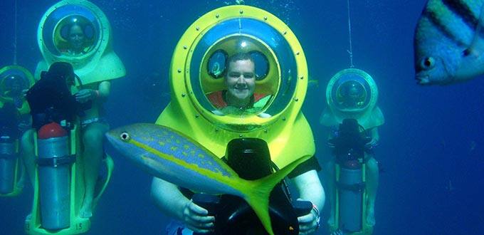 Experience the ultimate thrill on your own underwater motor scooter. The Breathing Observation Submersible Scooter, BOSS is the most thrilling way to explore the aquatic world. No scuba diving experience necessary and you are the driver! Your tour begins as you board the bus for a scenic drive to Ocean Connections’ dive facility. Here, you’ll board a 52-foot custom-built power catamaran for a cruise out to a beautiful reef.