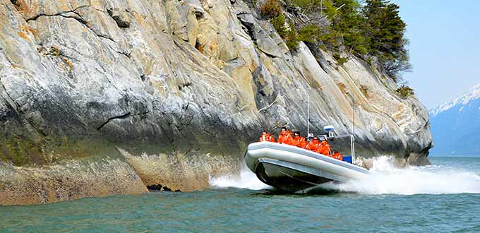 Get ready for an intimate boating adventure through the Lynn Canal, North America’s longest and deepest fjord! You'll get extra-close to the shore while exploring hidden coves, waterfalls, beaches and abundant wildlife on this fun filled, two-hour sightseeing tour. Your knowledgeable Captain will make multiple stops for photo opportunities and wildlife sightings, while providing a colorful narrative throughout the tour. Keep your eyes open for whales, eagles, seals, sea lions, mountain goats and sea birds as you explore the rugged wilderness of this majestic fjord. On occasion the captain will turn the engines off, allowing you to soak in the sights, sounds and smells of this pristine Alaska wilderness. Climb aboard the same type of boat used by U.S. Navy Seals and Coast Guard rescue teams. With its deep V hull surrounded by inflatable tubes this boat is designed to deliver a smooth ride in any ocean condition. You’ll straddle the custom shock-absorbing seats as you race by the steep rock walls of this spectacular fjord. This adrenaline-packed excursion covers more of Alaska’s rugged wilderness in less time, allowing you to spend the rest of your day exploring the historic gold rush town of Skagway.