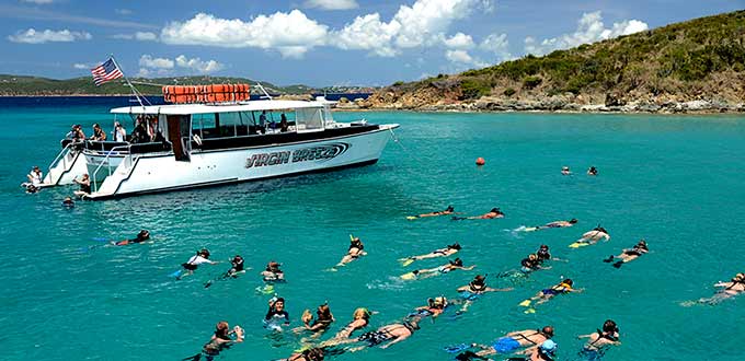 Zip through the turquoise seas off Charlotte Amalie in a powerful catamaran that will take you to one of the island’s premier spots for snorkeling. The one-level Powercat offers plenty of cushioned seats in the shade and sun so you can easily find a spot to your liking. Either way, the views will be wonderfully picturesque on the way to Buck Island. A different sort of tropical scenery awaits you beneath the water’s surface, as you will discover while snorkeling the island’s Turtle Cove. You might spot French angelfish, brilliantly colored damselfish and bright-blue tangs. Hawksbills and green turtles are prevalent and watching them gracefully swim by is a showstopper. Next it is off to Honeymoon Beach, on Water Island another idyllic setting that is great for swimming and beachcombing with its easy access.