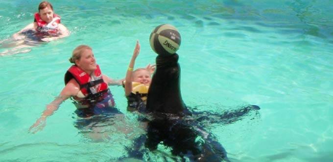 Note: Participants must be at least 8 years of age, weigh a minimum of 50 lbs. and be able to climb up a ladder and swim in a life jacket. Women who are pregnant may not participate. Wearing a life jacket is required. No observers are allowed in the sea lion swim area. Each child under 12 years of age must be accompanied by a participating adult. Guests are required to wear a life jacket and sign a release form. Due to the amount of interaction with sea lion trainers, participants must speak and understand English. Guest must know how to tread water and be comfortable in the water.