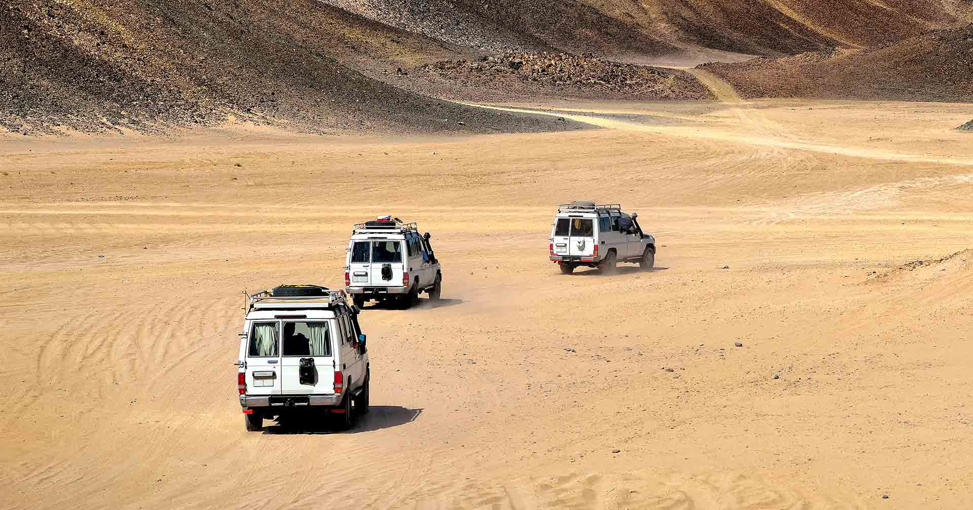 Enjoy an off-road adventure that highlights the sights and culture of the Arabian Desert. Starting off from the pier, you'll board your 4X4 vehicles and take a scenic drive to the Red Sea resort town of Hurghada. You’ll leave the paved road and drive into the Eastern Arabian Desert. With its desolate, rough terrain and stark rock-strewn outcrops, the desert offers excellent photo opportunities.