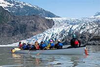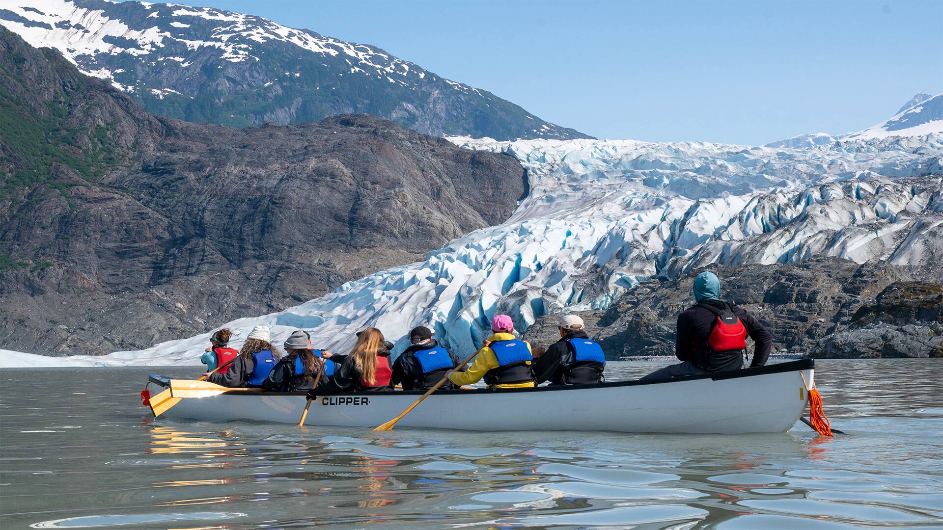 Paddle across the placid waters of Mendenhall Lake to Mendenhall Glacier, an ever-changing river of ice that is surprisingly close to Juneau. You will paddle across the water’s surface in a 12-person canoe that will present some of the most extraordinary scenery in Alaska as the Tongass National Forest surrounds the glacially fed lake. You can expect to pass an Arctic tern nesting ground and Nugget Falls, a roaring cascade that plunges nearly 400 feet before tumbling into Mendenhall Lake. Once you round a rocky peninsula, the glacier’s sheer face will come into view, a stunning sight especially if a large block of ice calves off with a thundering crack. The guides will describe some of its features, which include deep crevasses, vertical shafts known as moulins and seracs, which are towering columns of ice.