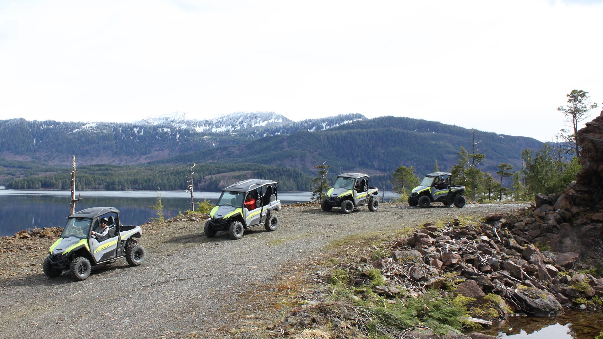 Ride through the wilderness in a Utility Terrain Vehicle designed for off-road adventure and admire the majestic panoramas while driving to and from Mahoney Lake. On the way to the base camp, you will enjoy spectacular views of George Inlet and Tongass National Forest. Still nothing rivals the exhilaration of hopping into the 2-seat or a 4-seat UTV and following the guide caravan-style up the mountainous 5-mile trail to Mahoney Lake. Whoever drives on the way up will switch positions and ride as a passenger on the way down. The serene lake and roaring Mahoney Falls are at the end of the trail, and both are well worth exploring. During stops, the guide will offer commentary about the history of Ketchikan, including the pulp mill at Ward Cove, which is longest operating such mill in Alaska. Back at the White River base camp, you can relive the experience while dining on vegan chili or a reindeer sausage.