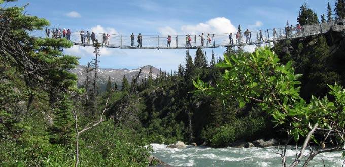 It is off to the historic and magnificent White Pass Train adventure. From an antique parlor car, enjoy the incredible scenery while your tour guide shares the stories and history of the Klondike Gold Rush. Upon reaching Fraser, British Columbia board your motorcoach and take a short trip to the Yukon Suspension Bridge. Then it’s time to experience the country that you heard about! Breathe pristine air, taste wild berries in season, hear the roar of raging white water and thrill to the sensations of a swaying walkway over 60 feet above the rapids. There are Tagish First Nation Staff and Elders to answer questions about the site. A variety of First Nations art pieces and crafts are available for purchase, as well. After your experience at the Yukon Suspension Bridge, you’ll continue on your motorcoach for the journey down the west side of the White Pass Canyon. Listen as your driver/guide entertains you with stories of the stampeders who trekked through the pass in search of gold. You’ll see picturesque points such as Tormented Valley and Pitchfork Falls as you head back to your ship.