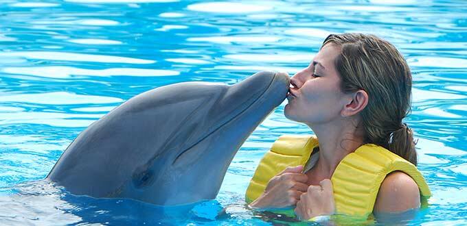 Upon arrival at Sanctuary Bay, one of the most natural and largest protected dolphin facilities in the world, you will begin your dolphin encounter. Learn about these amazing creatures as our professional dolphin trainers conduct an educational orientation. Interact with these friendly dolphins while they splash and jump around you, and then step on to a 3 foot deep submerged platform where you will touch, kiss and hug a dolphin.