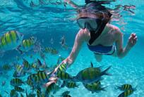 Snorkel the azure waters adjacent to the of Belize's Barrier Reef, the world’s largest living barrier reef. This is a shallow water entry, well suited for beginners and intermediate snorkelers. Depart from the Harvest Caye Marina on one of our comfortable snorkel vessels for the short scenic ride to a beautiful site along the reef. This location is teeming with multitudes of colorful reef fish, co-habiting among the beautiful hard and soft coral formations, intermingled with sponges, sea fans, and delicate sea anemones.