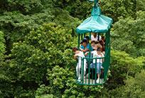 The Rainforest Sky Ride in St. Lucia provides you with a bird's eye view of a truly mature oceanic rainforest. Nurtured by warm, gentle rains and rich volcanic soils, St. Lucia's forests have achieved a state of ancient majesty. Gondolas safely glide you through and over the tree tops, where knotted and twisting woody vines wind to the tops of old growth rainforest trees. Dense thickets of surreal vegetation merge with cascades of flowers. Lavender stars, orange bursts, yellow berries and white lace thrive on the branches of fragrant flowering trees.