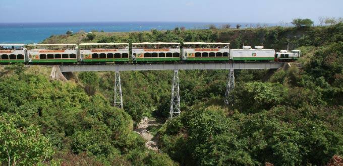 The lower level provides air conditioned comfort with expansive vaulted windows. Island ambiance is evoked with comfortable rattan furniture, complimentary specialty drinks, island music and a colorful narrative. The railway hugs the northeastern coastline with fields of sugarcane from the shoreline up to the mountains. The volcanic mountain ranges rise nearly 4,000 feet above sea level coated with lush green rainforests. The train rolls across tall steel bridges spanning deep canyons, and winds through small villages and farms. Your conductor will point out old sugar estates, sugar mills and windmills while giving insight in to the island’s unique history. Your experience is complimented by a scenic drive along the southern coast. Enjoy excellent vistas of Brimstone fortress, the British "Gibraltar of the Caribbean", Middle Island where an ancestor of U.S. President Thomas Jefferson’s is buried and the neighboring island of Nevis. A truly unique experience!