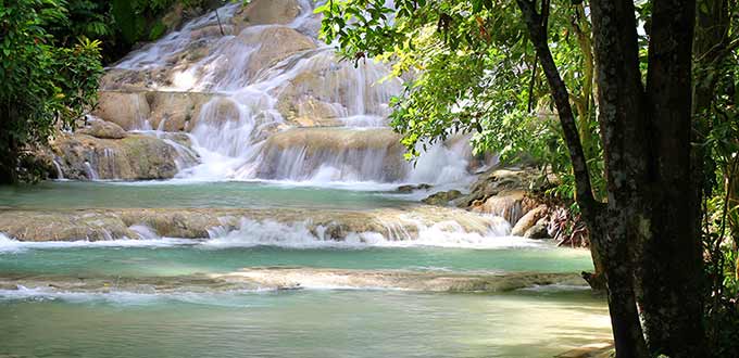 Travelling through Jamaica's beautiful countryside, you'll drive past some historic sites and districts on the way to Dunn's River Falls. Described as a living and growing phenomenon, the waterfall continuously regenerates itself from deposits of travertine rock, the result of precipitation of calcium carbonate from the river, as it flows over the falls. The small dome-shaped cataracts are usually associated with thermal spring activity found in limestone caves. Experience the thrill of climbing the waterfall, in a human chain led by experienced Falls Guides. Pause at the 'massage parlour' and experience the soothing effects of the water as it cascades over the rocks, to the sea.