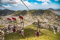 This is the ultimate package which will allow you to experience all attractions the park has to offer. Experience both zip lines; The Sentry Hill which takes you across the mountain ridge and the steepest Zipline line in the world. The Flying Dutchman! Consisting of two lifts the Sky Explorer brings you to the top of one of St. Maarten’s highest peaks while the scenery unfolds below you, and the Schooner Ride sends you surfing down the mountain in an inner tube. Board your air-conditioned transportation at the dock for a 30-minute ride to Rockland Estate. Each adventure begins in this restored plantation house originally built in the 1700s. The Museum tells the powerful story Trace Wilson who was born into slavery on the property in 1818 and her direct descendant Emilio Wilson. You will see depictions of what life was like on a plantation and learn about the customs, traditions, lifestyle and stories that earned Sint Maarten the nickname ‘The Friendly Island.’ Embark on the Aerial Sky Explorer for the approximately 25-minute ride to the top of Sentry Hill; one of St. Maarten’s highest elevations at 1,125 feet. The experience encompasses two chairlifts as well as a series of platforms encircle the mountaintop showcasing 360-degree views of the island including vistas of neighboring islands Saba, St. Eustatius, St. Barts and Anguilla. After your orientation at the transfer station, you will put your safety equipment and harness system for your Sentry Hill Zip Line flight over the mountain ridge. Board Lift 2 to the top of Sentry Hill and a brief orientation will prepare you to fly down the mountain on the world’s steepest zip line, The Flying Dutchman. You’ll be attached to a flight line in a secure harnessed chair, launching you on the 1050-foot drop in elevation over 2800 feet to experience the ride of a lifetime. To complete your top-to-bottom thrill ride, the Aerial Sky Explorer will take you to the Schooner Ride Station where you’ll surf down the mountain in an inner tube through the curves and straightaways of a specially designed track. After your fun-filled adventure, souvenirs and attraction photos are available for purchase in the gift shop. Emilio’s Restaurant, nestled among authentic antique colonial walls offers a menu of classic favorites with a new twist. Food and beverages are available for purchase. When you are ready to depart, after exploring the estate, board your air-conditioned transportation back to your ship.