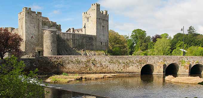 Before you reach the town of Cashel, the rock that bears its name appears on the skyline, rearing up from the landscape in a series of limestone ridges and topped by the serenely beautiful Cathedral of St. Patrick. Visit the Rock of Cashel, an impressive pre-Christian settlement. Enjoy lunch in a restaurant nearby. Travel to Cahir, located on the River Suir to visit Cahir Castle. Rooms in the keep are whitewashed and contain armor displays and period furnishings from the 16th and 17th centuries.