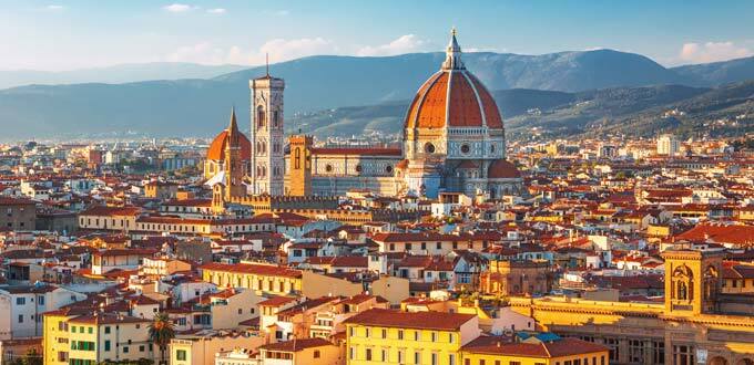 Take a scenic drive through the countryside to the magnificent city of Florence. Pause in the Piazza del Duomo to admire the exterior of the Cathedral (Duomo) of Santa Maria del Fiore, its elaborate Gothic façade is covered in a mix of pink and green marble.